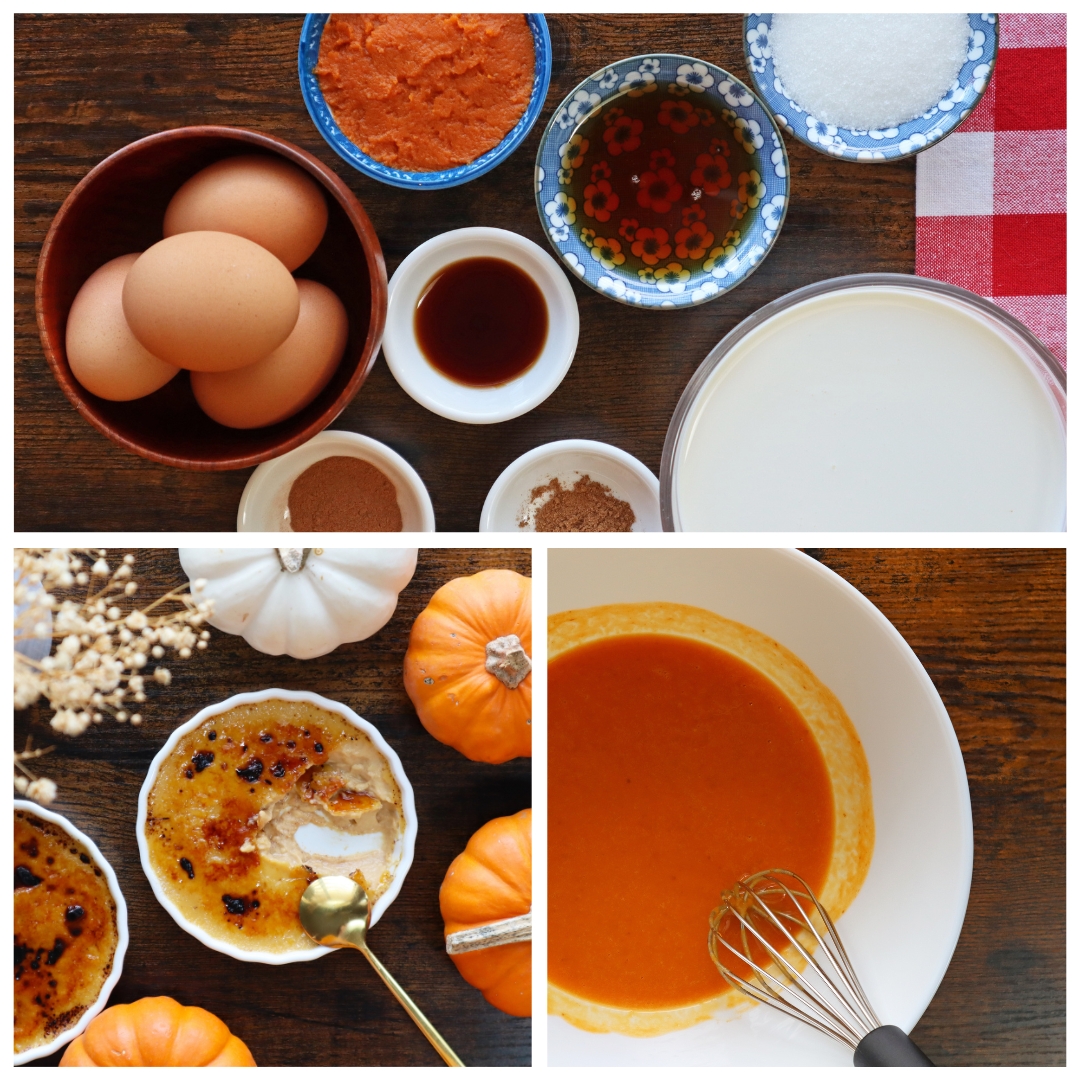 - Make the Custard:In a mixing bowl, whisk together the egg yolks, ¼ cup sugar, and pumpkin purée until smooth.While whisking constantly, slowly stream in the warm cream mixture until fully combined.Strain the custard through a fine-mesh sieve into a large measuring cup or jug for easy pouring.